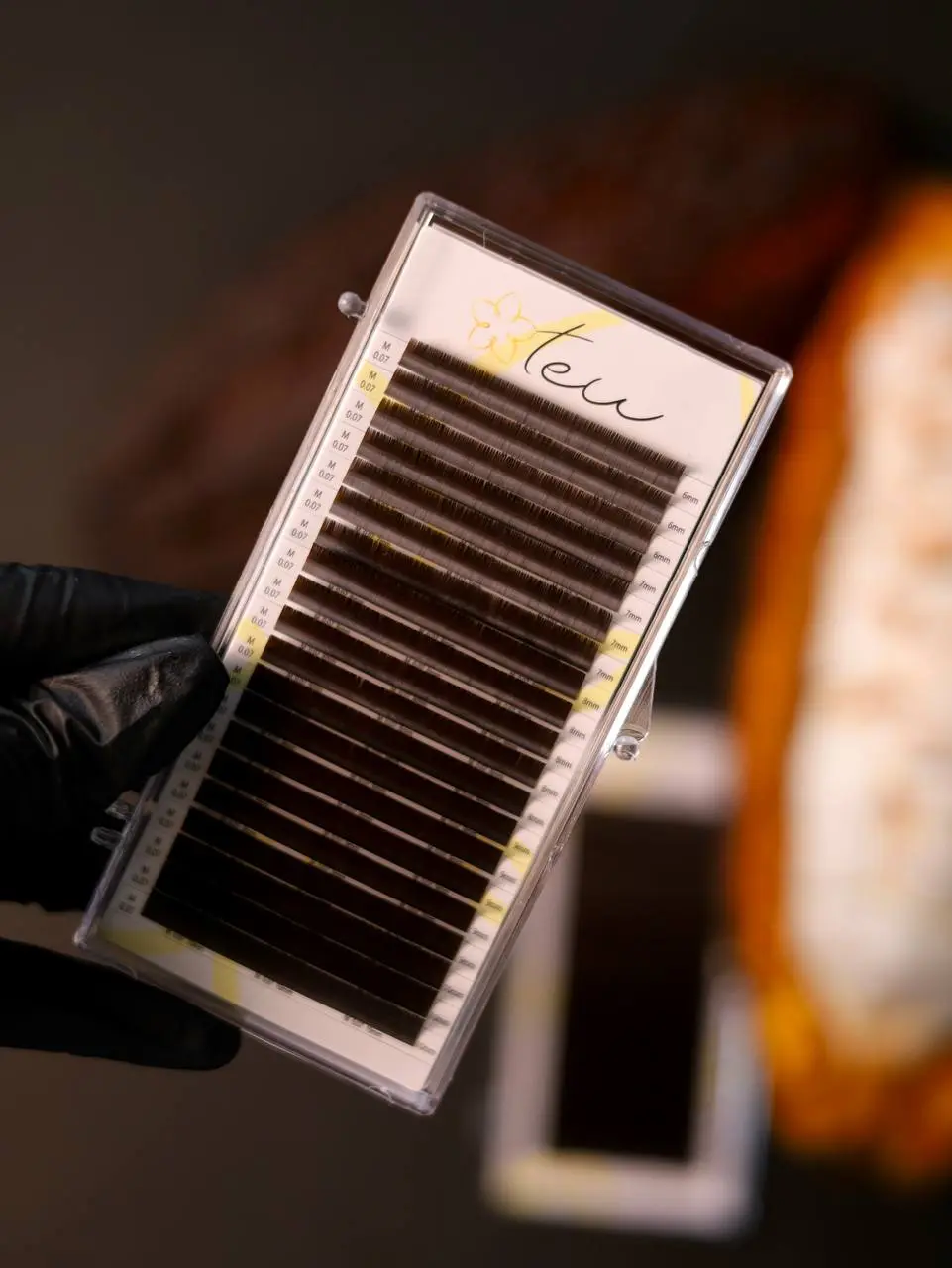 Стрічка жовтого кольору, з липкою основою, що дозволяє швидко знімати вії та зберігати клейкість при повторному використанні. На ній розташована вся необхідна інформацію про вії: товщина, довжина, вигин.